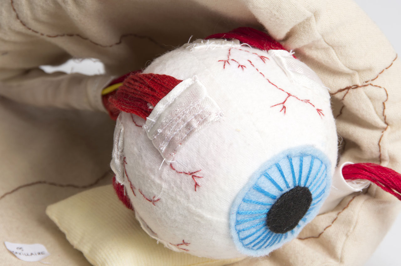 Modèle agrandi de l’œil et des muscles oculomoteurs dans une orbite en coupe sagittale. Les muscles sont représentés par des fils de coton qui se rassemblent dans une boutonnière au fond de l’orbite ; on peut activer les mouvements de l’œil en tirant sur ces fils. Les différents muscles et le nerf optique sont indiqués par des étiquettes, ainsi que les os composant l’orbite, dont les sutures sont brodées sur le tissu.